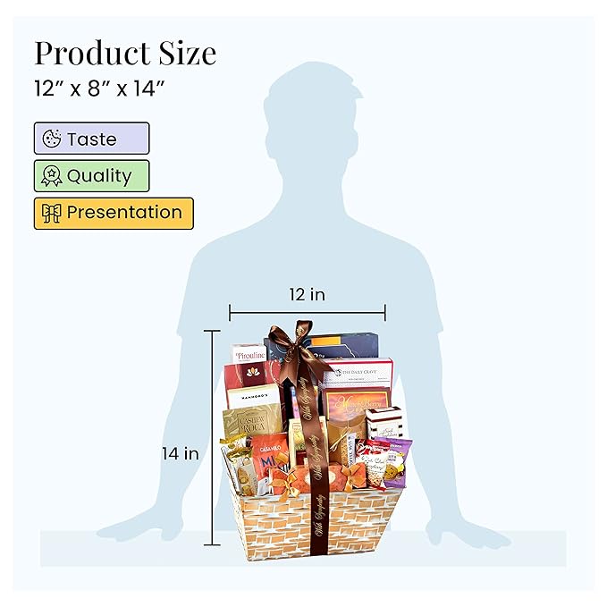 - BEST-SELLING ASSORTMENT: Filled with 4 lbs of our popular snacks, selected from our customer favorites. This sympathy gift basket includes gourmet cookies, popcorn, chocolates, candy, nuts and more. Each gift basket measures 12" x 8" x 14".